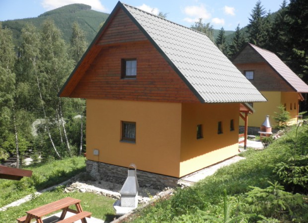Chaty č. 6-8 jsou srubového typu a jsou v provozu od června do září. V přízemí je obývací pokoj s posezením (rozkládací pohovka), kuchyňka s chladničkou, el. indukčním vařičem, mikrovlnnou troubou, varnou konvicí, nádobím, kuchyňskou rohovou lavicí k sezení aj., koupelna se sprchovým koutem a WC a jeden 2-lůžkový pokoj. Na vyvýšeném empore (vhodné pro osoby starší 8 let) se nachází 2 lůžka jako přistýlky. Vytápění všech objektů je el. přímotopy, ohřev vody boilerem.